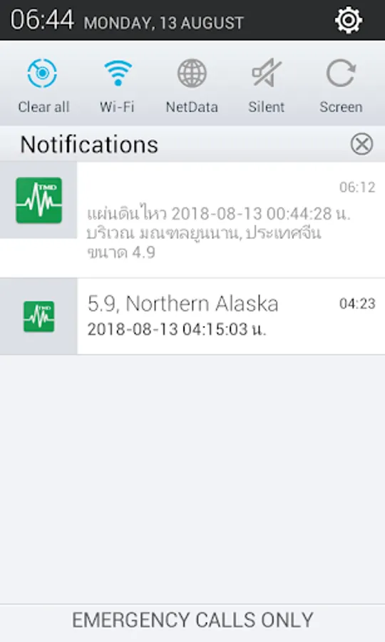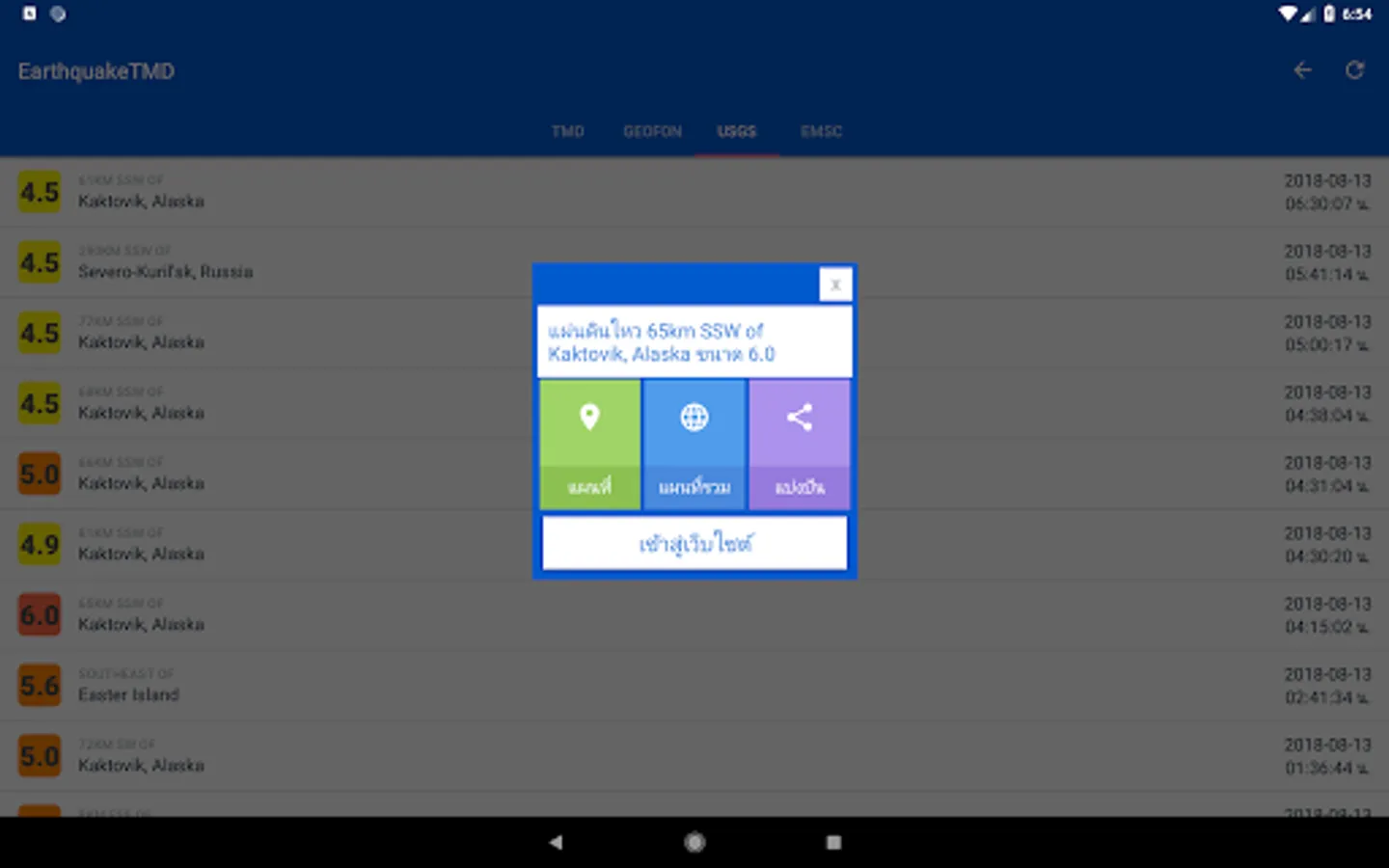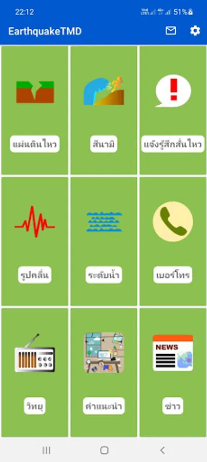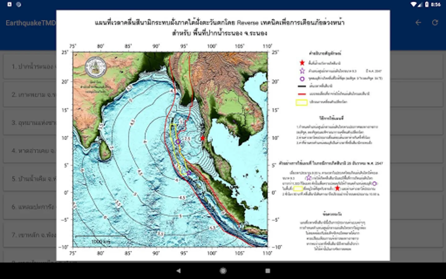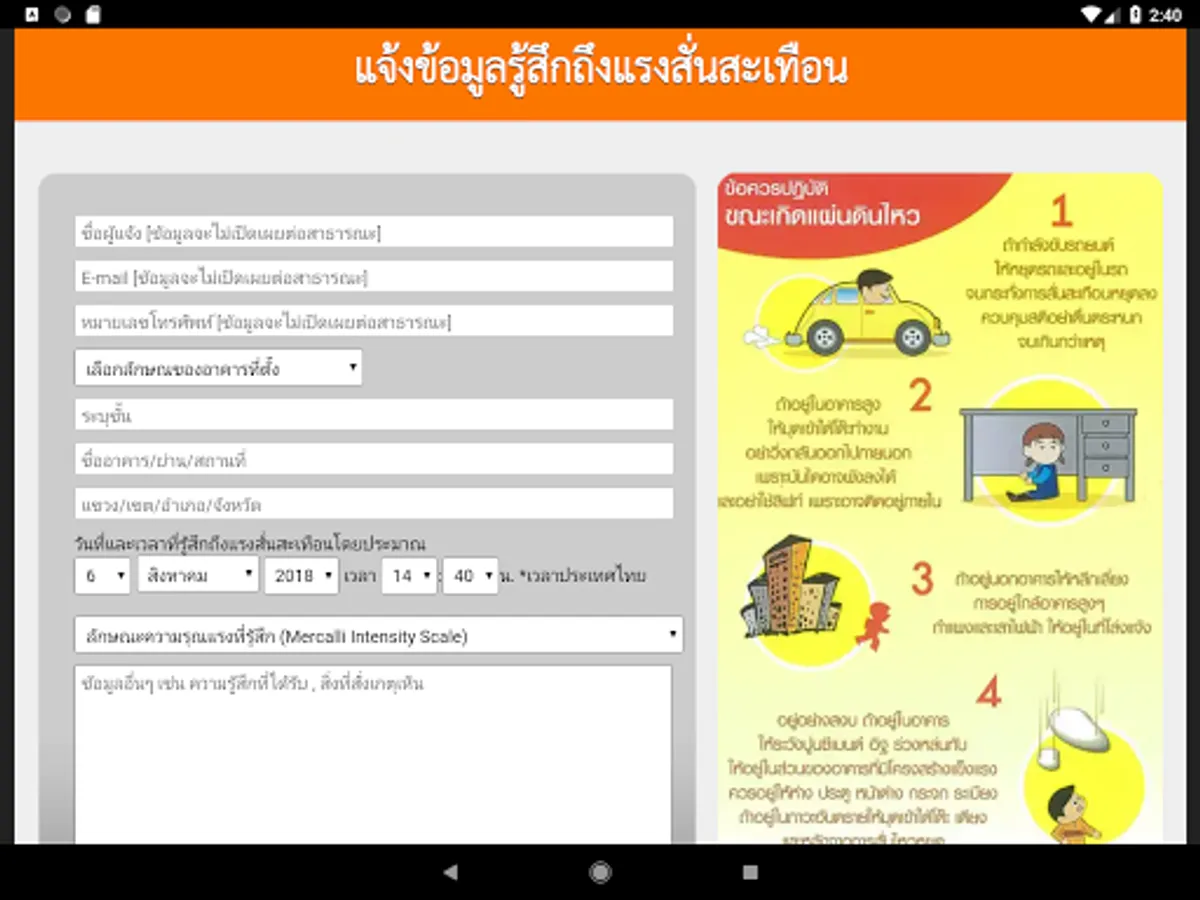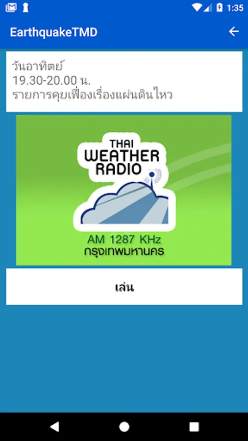 Earthquake report in Thailand from the earthquake surveillance department Meteorological Department Global seismic reports from agencies GEOFON, USGS, EMSC. Tsunami forecasts from the depth and magnitude of earthquakes at sea. Listen to radio from the Meteorological Department radio station. Graph showing seismic waves, sea level, emergency numbers Actions when earthquakes and tsunamis Earthquake and tsunami news Notify urgent news messages via Notification
