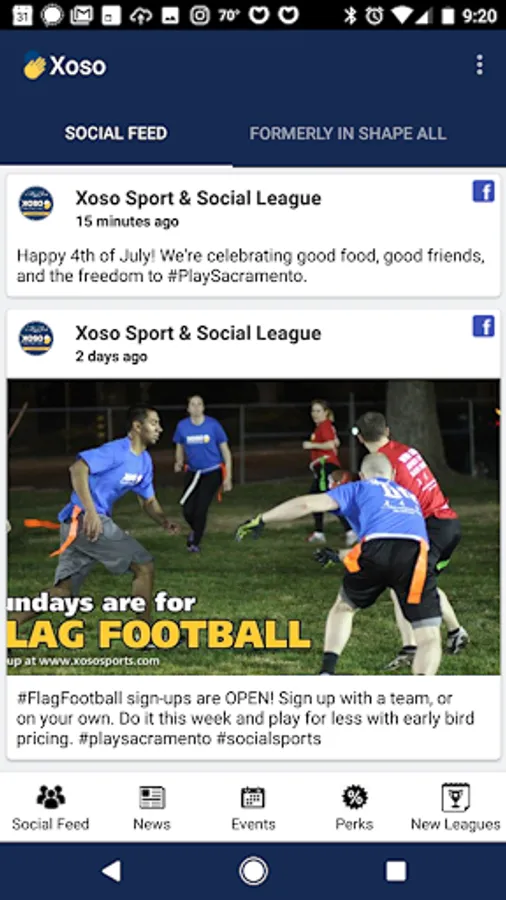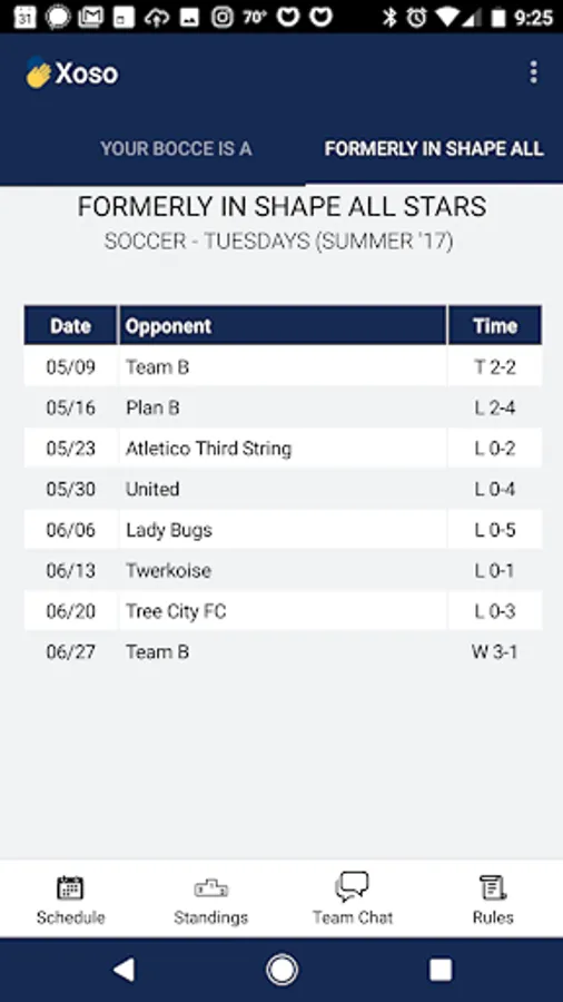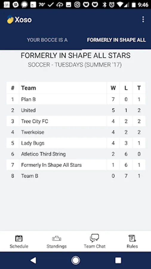 The Xoso Sport & Social League Android app allows players to get notifications (rainouts, results, league news, and more), chat with their teammates, receive discounts around town, and view team schedules & standings on their mobile device.