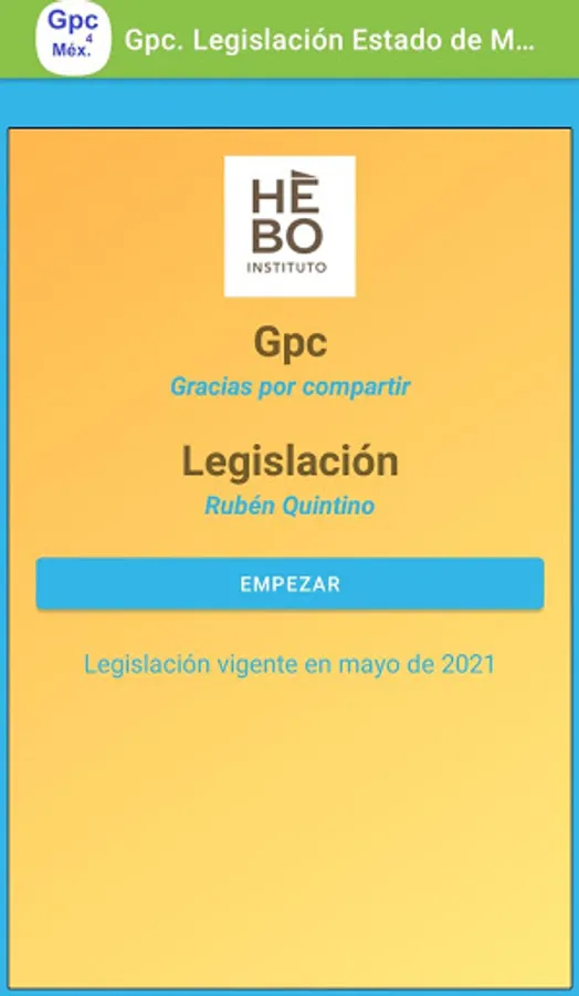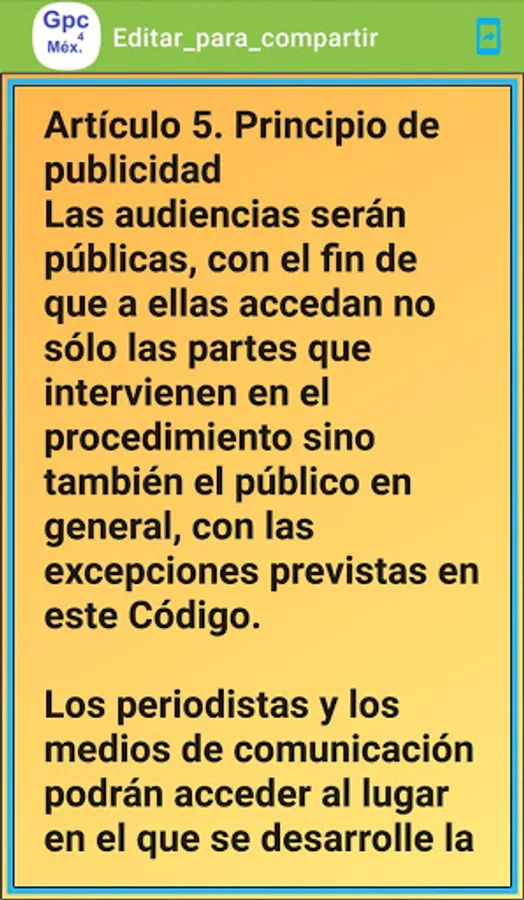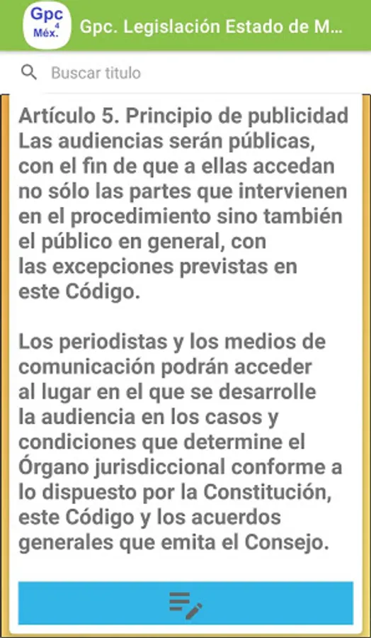 The “APP” is based on the grouping of: The Political Constitution of the United Mexican States, the National Code of Criminal Procedures, the Federal Criminal Code and the Criminal Code of the State of Mexico; in order to form the appropriate group of material to be able to study, analyze, consult, comment, suggest, edit and share the Penal Code.