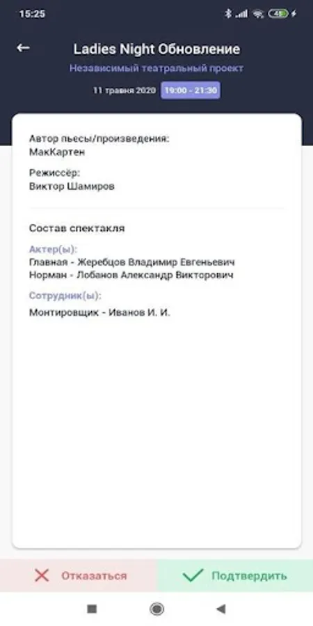 The mobile application was created for the convenience of actors and technical staff. This is a mobile calendar in which all the performances and rehearsals with your participation are visible. You receive notifications and can confirm participation in one click.