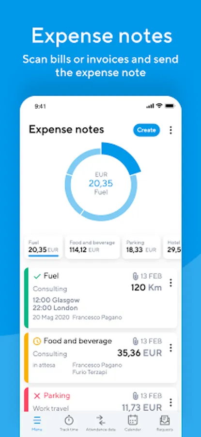• Expense notes: Scan bills and receipts and generate the expense note, single or a group of expenses. A tidy paper free management.
