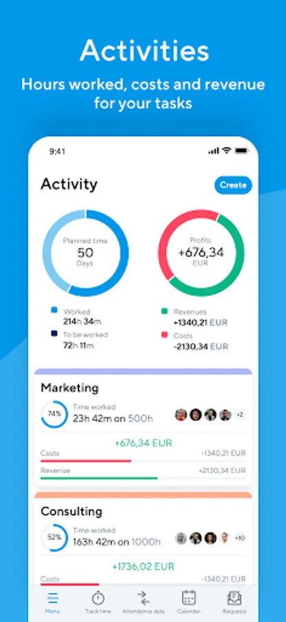 • Activities: Plan activities and tasks to improve the performance. Combined with hours worked, costs and income.