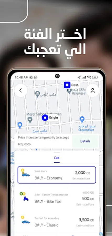 The application allows passengers to choose the preferred type of car and preferred payment method, all of this, at competitive prices in the market because Baly always saves you 50% of market prices.