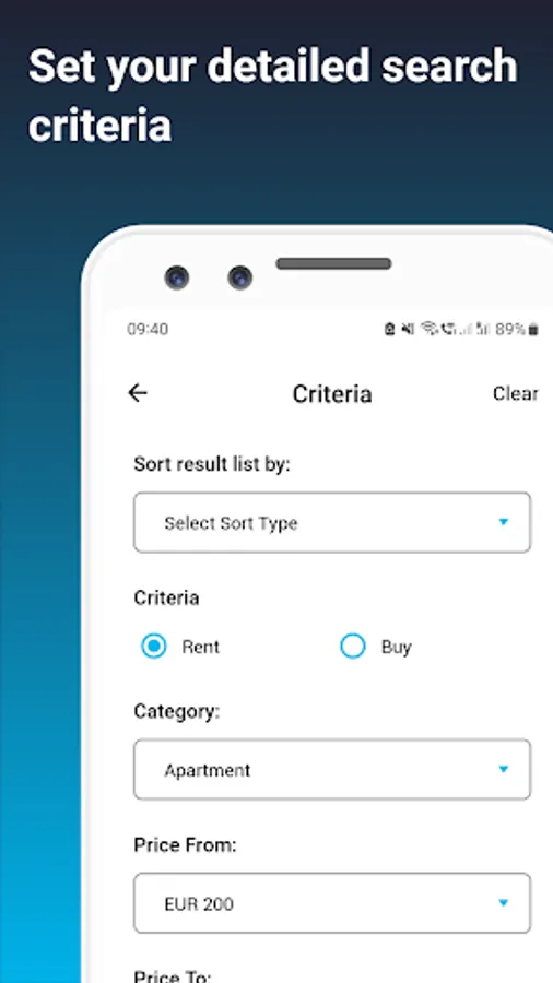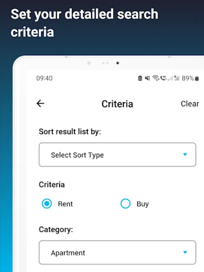 - Select properties according to criteria such as the location, type of property (house, apartment, parking etc.), rental price or number of rooms.