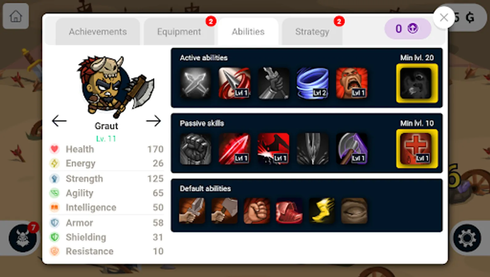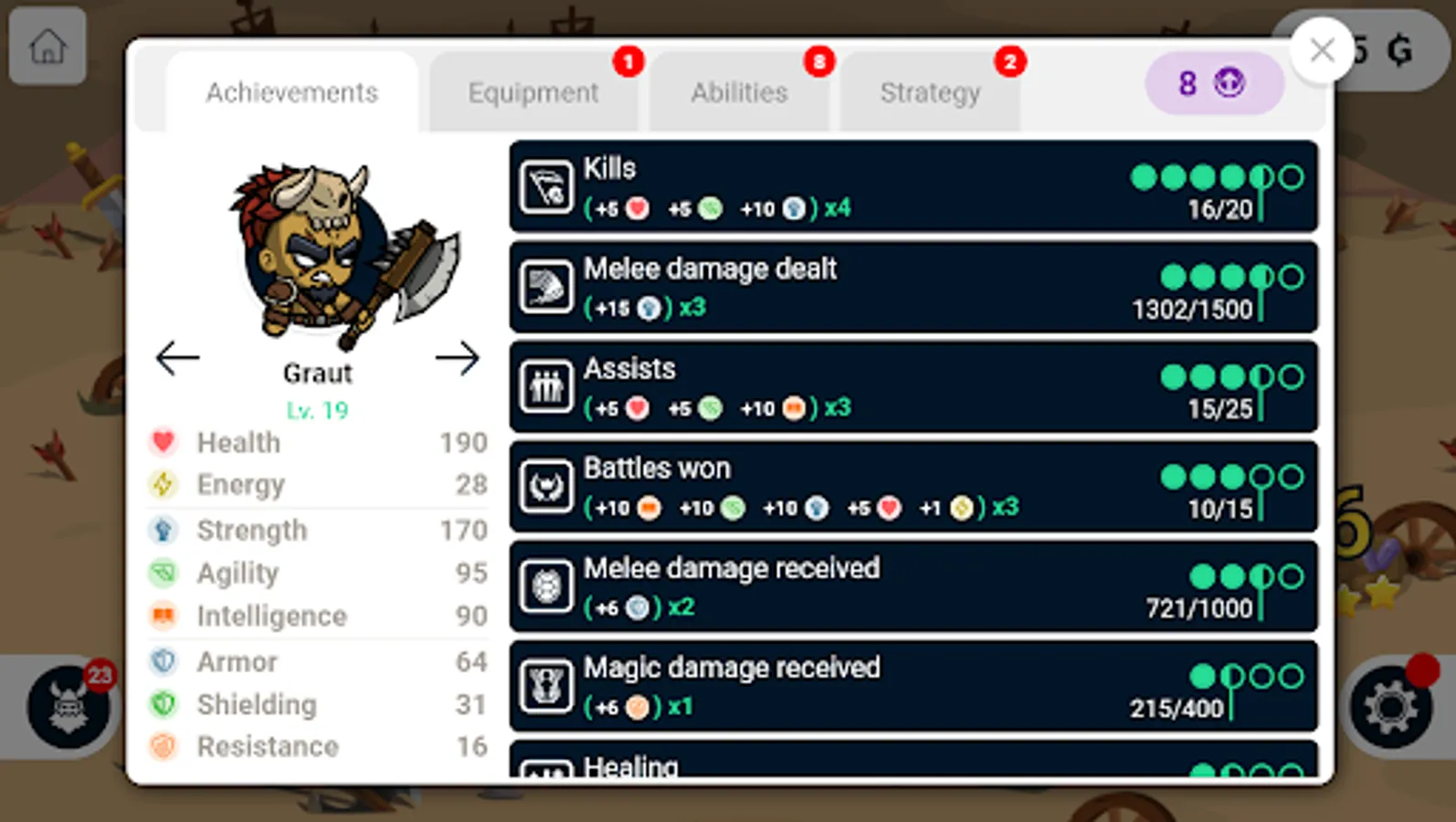 Hero's level up whenever they finish an achievement. Achievement can be earned during combat and will strengthen your hero as well as unlock new abilities.