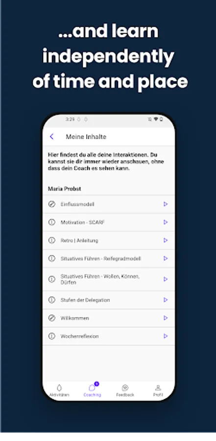 The BeCoach app offers you the possibility to connect with your coach, trainer or another consulting person so that they can assist you in your individual process. This person can support you via chat or with learning units, exercises and other formats in the app and help you to achieve your personal learning success.