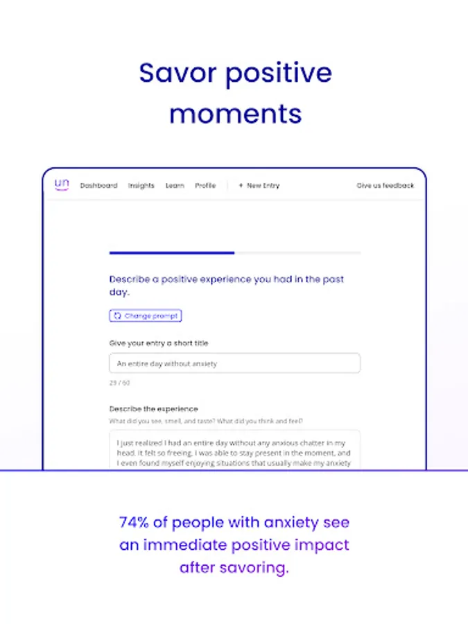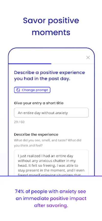 The Savoring Journal: Find joy and gratitude in daily life. 74% of people with anxiety see an immediate positive impact from a savoring entry.