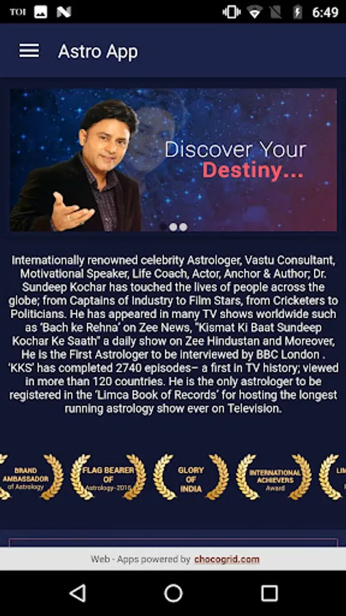 This App for Astro science will provide you daily feed of astro updates online, with the efforts of your astrologer Sandeep analyzing your horoscope's stars position and planetary movement for your sun sign. The Astro App (Astrology & Horoscope) is the best android app for astrology today, and as much the best astro app for apple ios phones. With lines of predictions in 2016, 2017 with record accuracy, 2018 and the rest of the 20** years shall remain safe with the crystal maze ball in the hands of Dr. Kochhar. He also gazes your astrology chart & full horoscope for personalized astrology services provided over the app, call, chat, email & phone on paid basis.