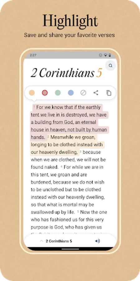 - Highlight and Save - Highlight and save your favorite verses to remember what you have learned.