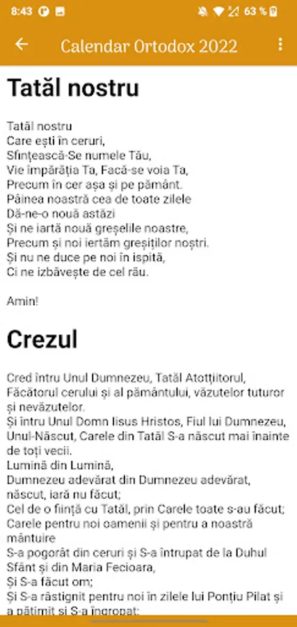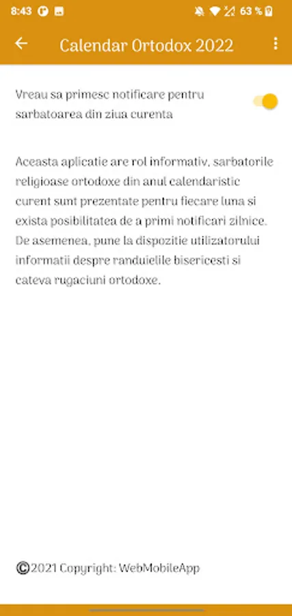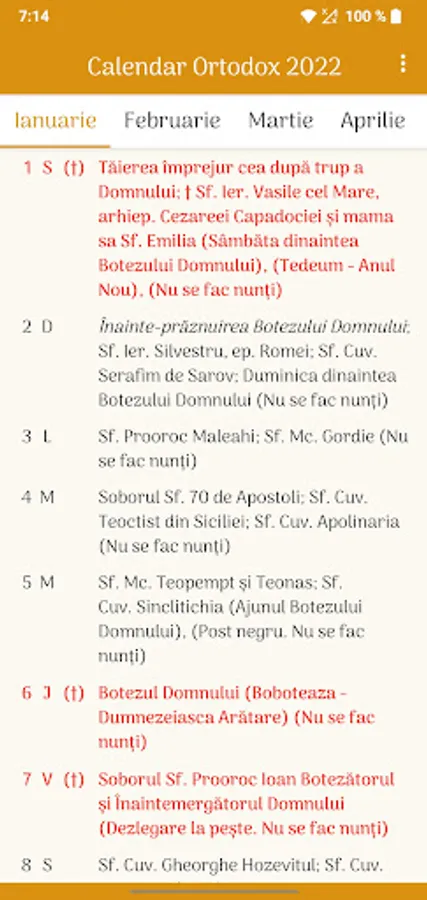 This application has an informative role, the Orthodox religious holidays of the current calendar year are presented for each month and there is the possibility to receive daily notifications. It also provides the user with information about church ordinances and some Orthodox prayers. The application will be updated every year to have the updated content without having to download a new application.