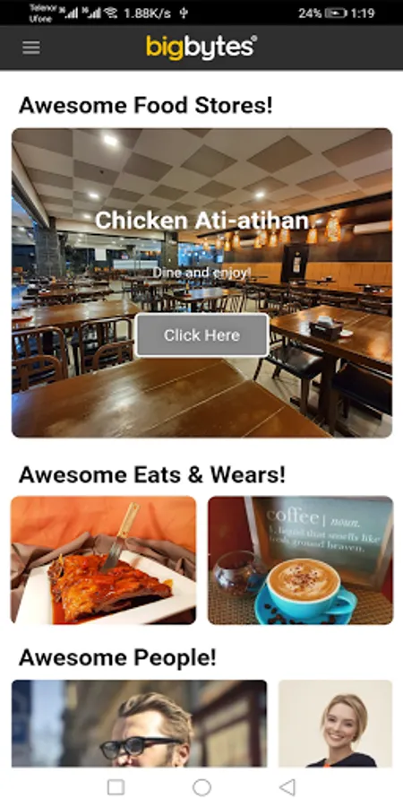 Purchase food from the best restaurants, cafés, snack shops and all of your other favorite stores in your city with the comfort and convenience of your home or work place. You no longer have to burden yourself of that super long, time consuming, and energy demanding task of buying your wants or necessities when all you need to do is ask us to do all of those for you. Tiring yourself of that process is not worth it. Browsing products and services in our app is just as easy as turning on Netflix and picking a movie that you want to watch. Our intuitive user interface (UI) will not confuse you as it is direct to the point. You will not get lost inside the app due to a disorganized structure and it's friendly to non techies. It is beautiful to the eyes as it is useful. Our UI is designed to be modern to adapt to the times but also simple and minimalistic to give the customer confidence to follow along the different sections of the app thus making sure of a great user experience (UX). It doesn't stop there as we not only offer food, but so much more. You can buy your monthly groceries and toiletries, medicine, even office supplies. And you don't have to do your errands by yourself anymore. Sending out documents and other basic errands are also available in BigBytes.