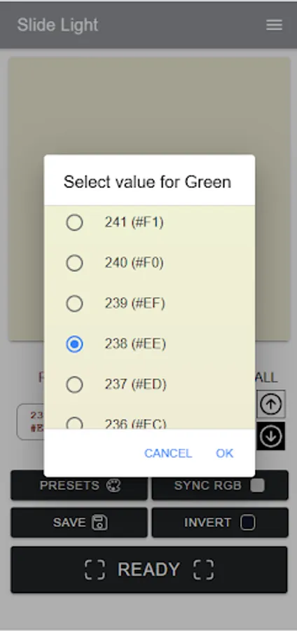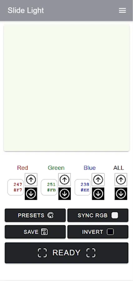 Slide Light allows you to create a customized backlight for transparent photographic slides for use in a photo scanner. Once you pick a color and press 'Ready', you attach a slide (by taping or any other means) to your device. Then place it face down on a scanner and scan it into your PC.