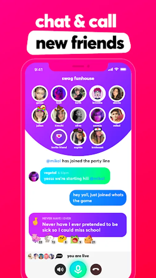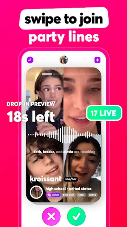 Drop in and preview voice chats with groups of new people that match your age and interests, and join in on the conversation to start talking and meet new friends.