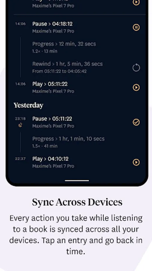 Every action you take while listening to a book is synced across all your devices. Tap an entry and go back in time.