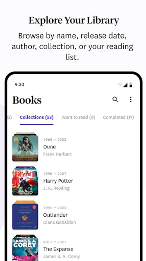 Browse by name, release date, author, collection, or your reading list.