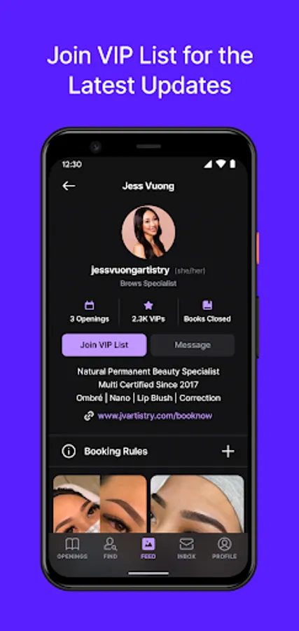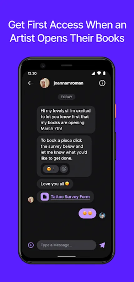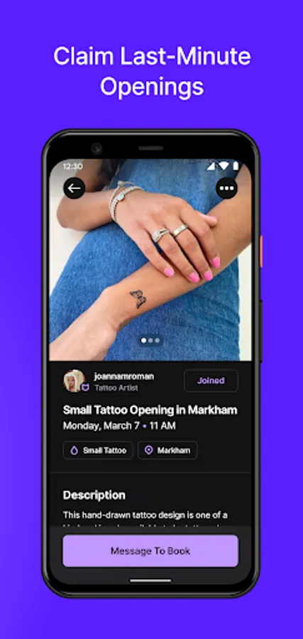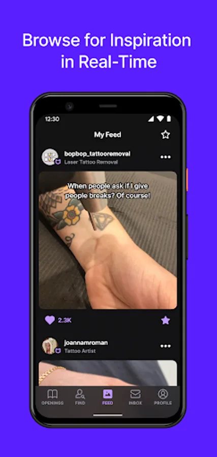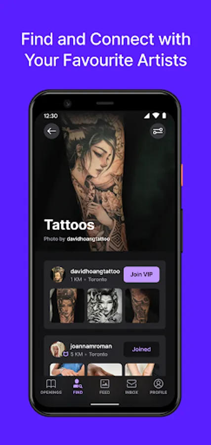Browse, follow and connect with your favourite artists near you. Going on a trip? Change your location and find an artist near you. Want a tattoo today? Check our openings feed and browse based on openings. Have an artist you really want to get work done by but their waiting list is long? Join their VIP List for first access to their openings.
