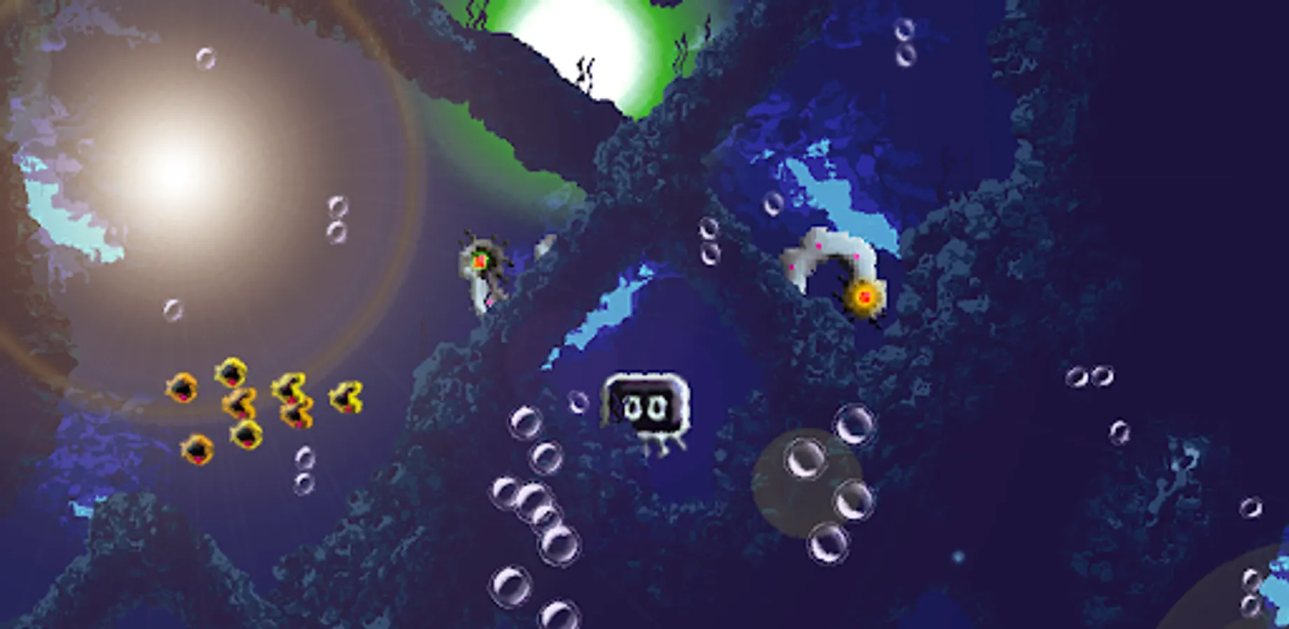 Hyperactive jellyfish battles undersea cretins in a beat-by-beat, free-moving shoot-em-up. Complete 4 layouts, aim for high scores, compare them to people's higher scores. Sink or swim.