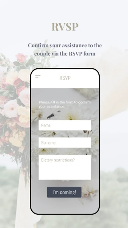 An example wedding invitation app that can be personalized for your wedding. This app includes dedicated wedding menu, story, photostream that invitees can add to, and RSVP functionality. This can be quickly customized for any wedding or similar event using Bravo Studio and Airtable.