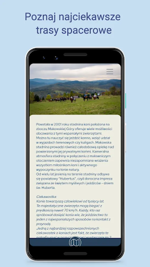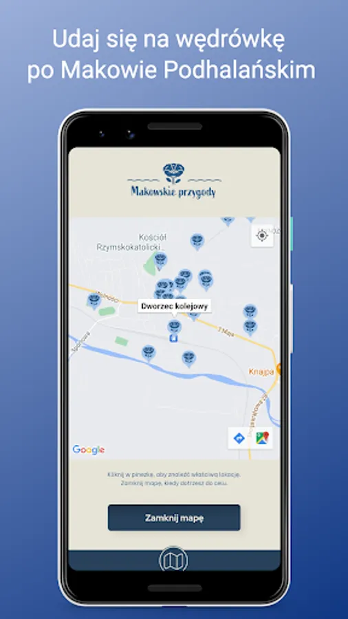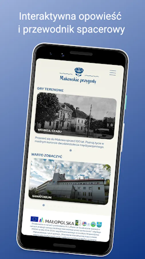 Implemented under sub-measure 19.2 "Support for the implementation of operations under the community-led local development strategy" covered by the RDP for 2014-2020, co-financed from the funds of the Małopolskie Voivodeship, operation title: "Creating an interactive map of educational and cultural paths together with a mobile application for the phone in Maków Podhalański”