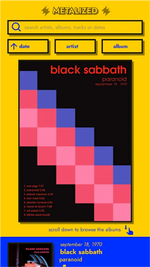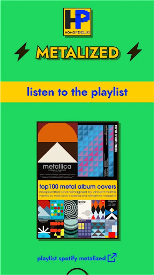Inspired by the Rollingstone's top 100 metal albums, metalized is an experience to discover or rediscover the most famous metal albums. Each album has a new cover, redesigned by vincent mathis from homopixelus. metalized gives you access to information about every showcased album, its official music video (when existing) and a track of the designer's choice to listen in Spotify. A link to a Spotify playlist of this selection is also available in the app.