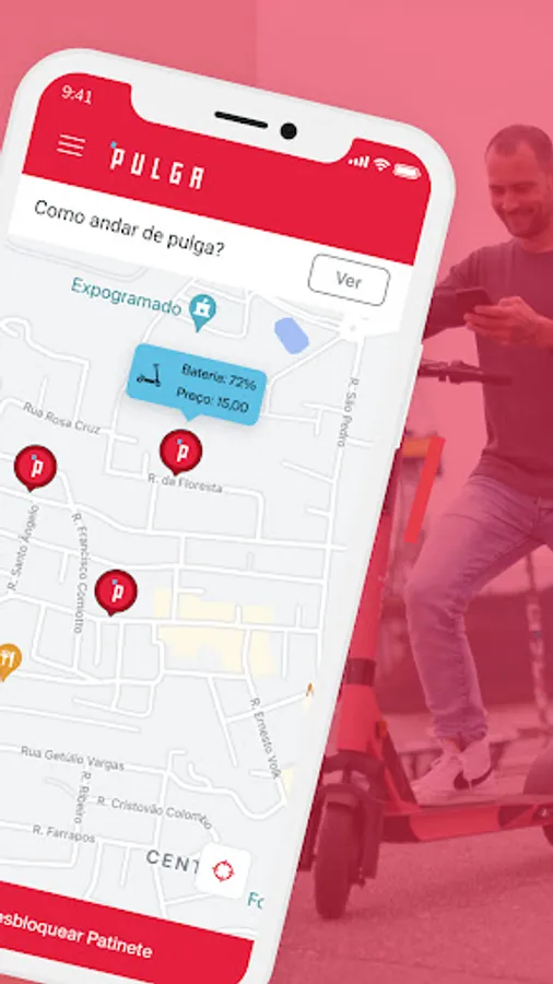 With Pulga you can find, unlock and ride shared electric scooters deployed all over Gramado/RS.