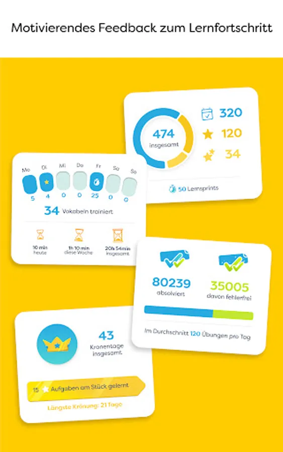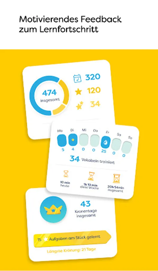 Collect points, unlock profile pictures and track learning statistics: the learning process can be experienced and celebrated. The query mode also checks the progress in each list.