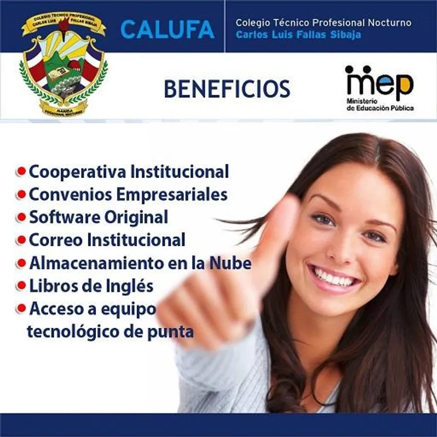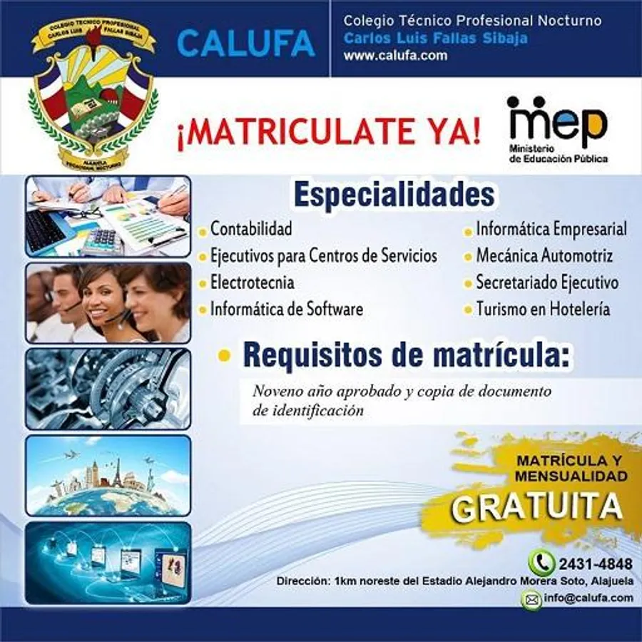 Professional Technical College Night Carlos Luis Fallas invites you to join their student community and offers technical options in 8 races in high demand in the labor market. Study for free without paying monthly installments on a night time and great service available, ample parking, photocopying service, fitness center and comfortable facilities. All our careers include in their classes using cutting-edge laboratories and workshops also incorporate them into our curriculum courses in English and the use of technological tools. In addition to workshops in the field of research, customer service, spelling and writing and aspects related to the development of emotional intelligence of our students. We are an institution certified in Quality Management, the Costa Rica Institute of Technology and the Technical Education of the Ministry of Public Education.