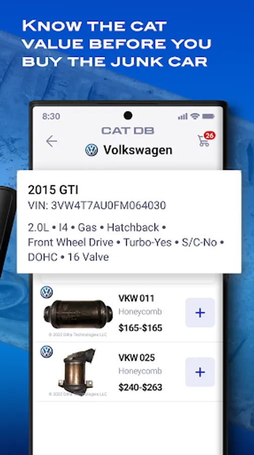Enter the VIN or year/make/model of the junk car and instantly get cat prices and quantity of cats per vehicle.