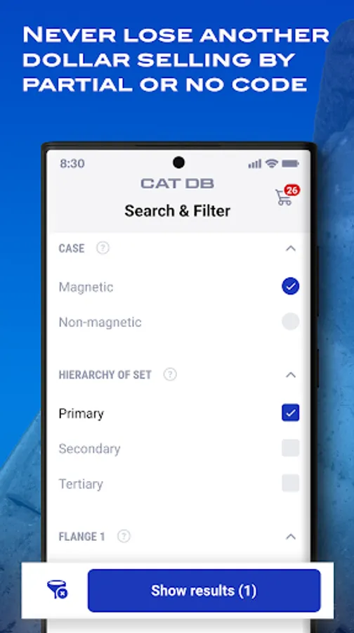 Use 28 specs filters (size, shape, brand, sensors, pipes, etc.) to quickly identify cats with rusty or hard to read codes.