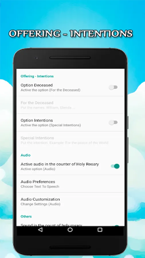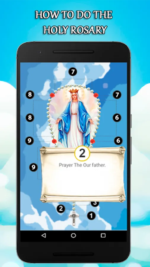 It contains the main sentences that make up the Holy Rosary, you can also select additional sentences to form a prayer depending on the need of the end user.