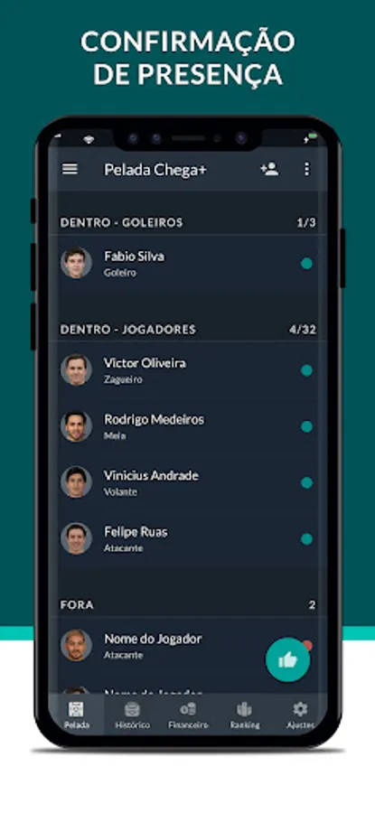 Now you can retire that terrible list of names on social media! With the game scheduled, football players receive a notification to confirm their presence and Chega+ is responsible for organizing, in real time, the list of confirmed players and letting everyone know who the football players will be participating in.