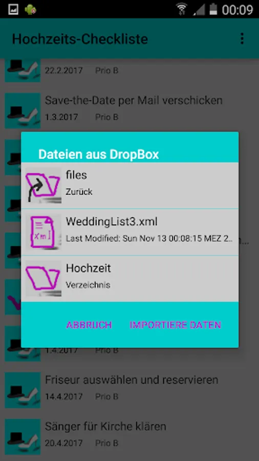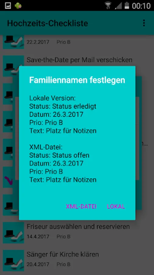 The list can be exported as XML and loaded at another smartphone with the same app. After re-importing the data differences are displayed; so synchronization across multiple devices is possible.