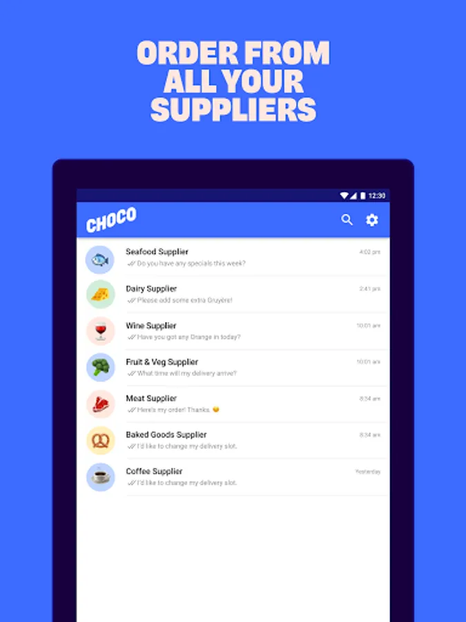 - Order from all of your suppliers, from anywhere - Choco is available on all mobile and tablet devices