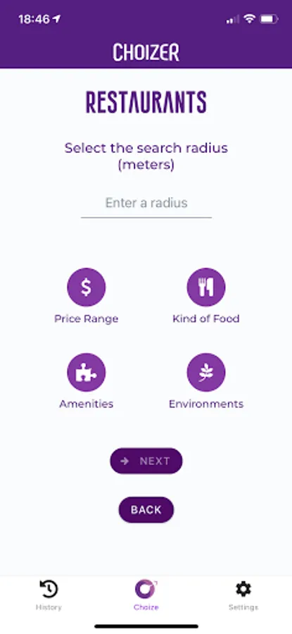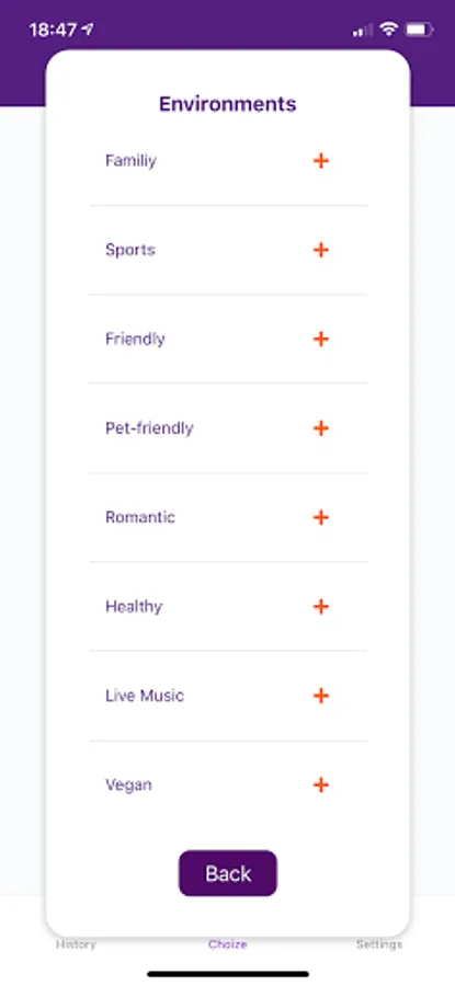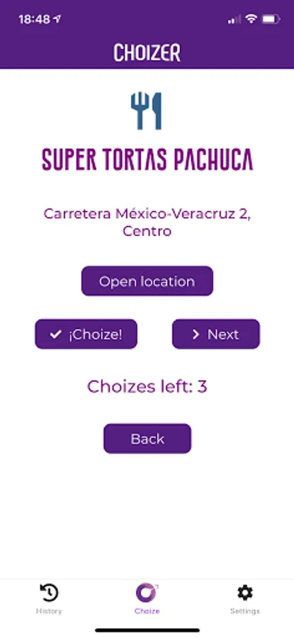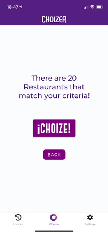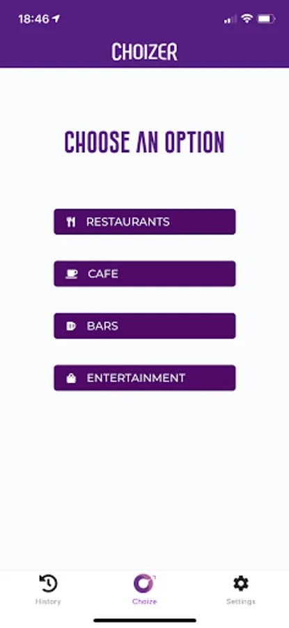 Choizer is a randomizing app that helps you navigate among the thousands of options available in your city. Select among Restaurants, Coffee Shops, Bars or Entertainment places in your city, choose the criteria that best fits your wants and needs and let get your Choize! You can either accept the option or skip it. If you skip it you can get another one with the same characteristics, but if you accept it be ready for a fun evening! The place will be saved in your history so you can review the places you have been to.