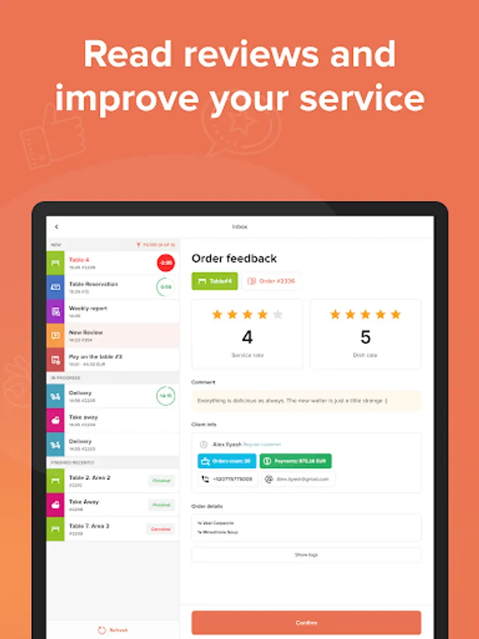 The application has the ability to receive and process requests for table reservations and work with reviews that your guests leave online.