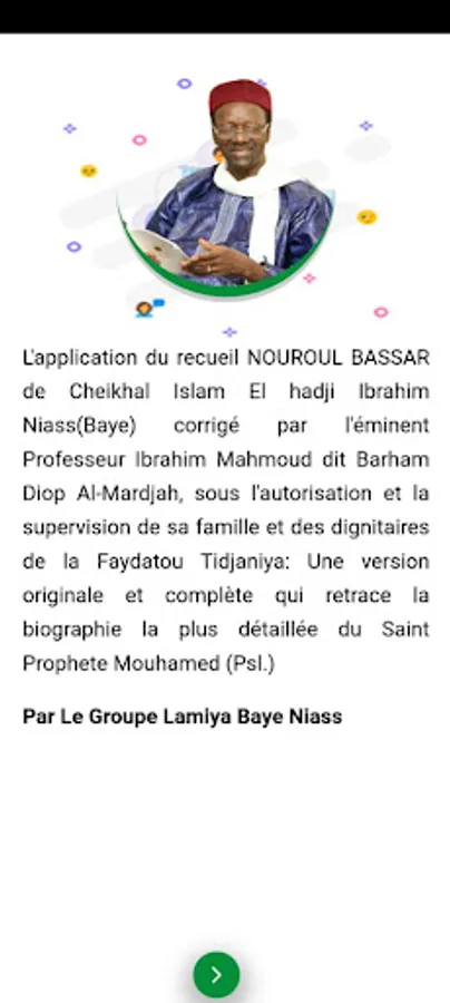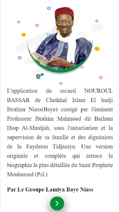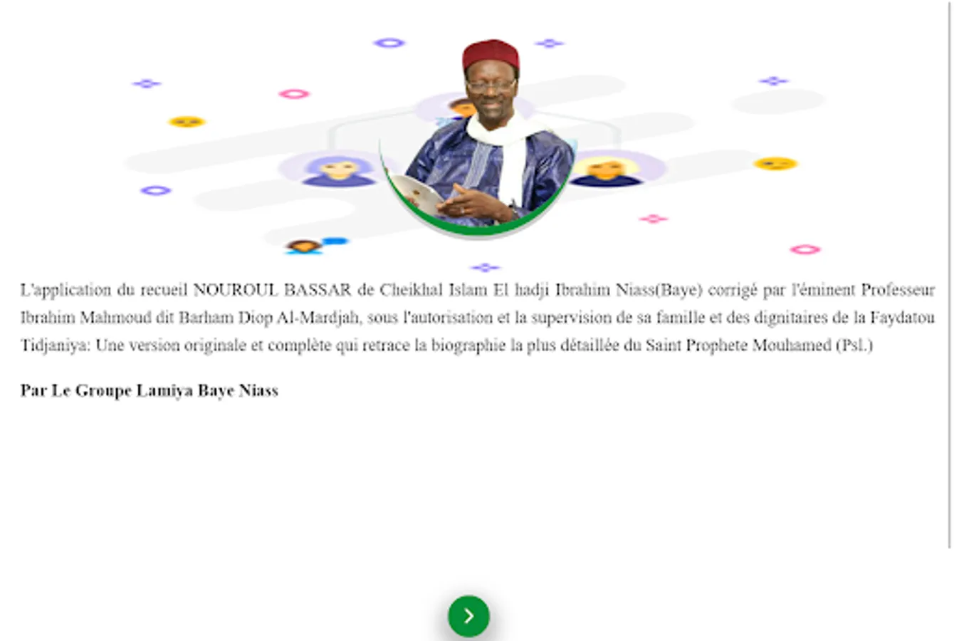 The application of the collection NOUROUL BASSAR by Cheikhal Islam El hadji Ibrahim Niass (Baye) corrected by the eminent Professor Ibrahim Mahmoud said Barham Diop Al-Mardjah. An original and complete version which traces the most detailed biography of the Holy Prophet Muhammad (Psl.)