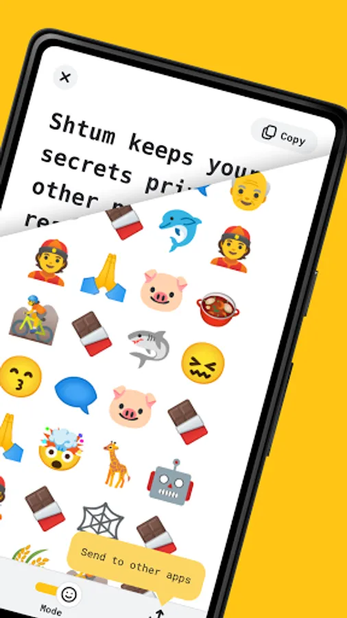 Hide spoilers in your social posts. Protect your diary entries from prying eyes. Communicate covertly in a group chat. Keep important details, like pins, passwords and phone numbers private. You can do all this and more using Shtum - the app that lets you instantly turn text into seemingly random emoji.