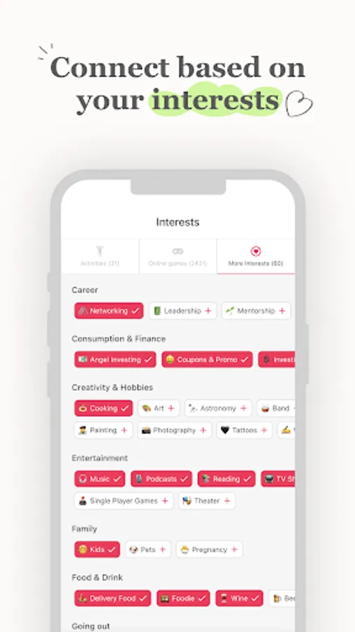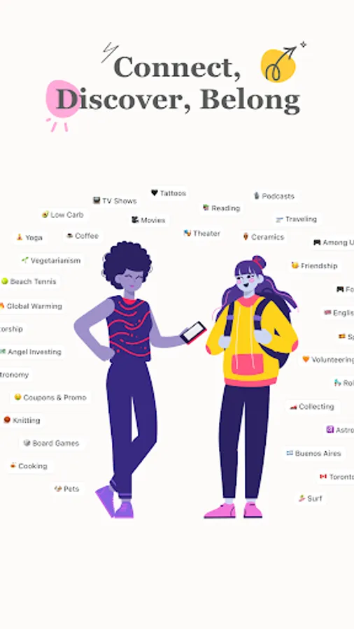 Create your profile with your favorite interests, discover other people who share the same topics, find colleagues by geolocation, and participate in exclusive group chats.