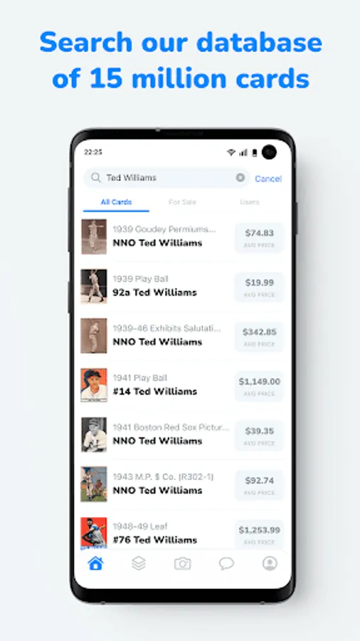 Search 17+ million cards in our database. See what cards on CollX are listed for sale right in search results. And if you find a card you own, but don’t have it handy to scan, you can easily add it from any of the records in the CollX database.