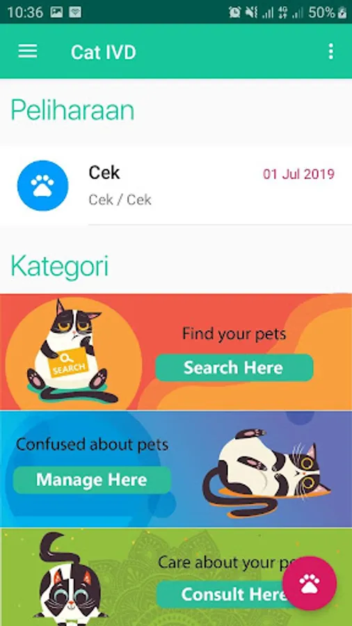 The Cat IVD Apps application was developed by the Community Service Community PKM team consisting of five IPB University Veterinary Medicine students namely Dian Utami, Fathan Abdul Aziz, Resti Puspitaningsih, Yaomil Ashar, and Syahrul Fadillahir Rachmad. The PKM Cat IVD Apps team was guided by Drh Mokhamad Fakhrul Ulum, MSi, PhD. This community service program has been funded by the Ministry of Research, Technology and Higher Education with the number SK B / 81 / B.B3 / KM.02.01 / 2019. This community service activity is in collaboration with the IPB University Animal Hospital, Department of Agriculture in the Bogor City Animal Health and Bogor Regency Fisheries and Animal Husbandry Service. In addition, this service program has been implemented in Pakuan Regency Bogor City Housing and Housing of Dramaga Permai 5 in Bogor Regency.