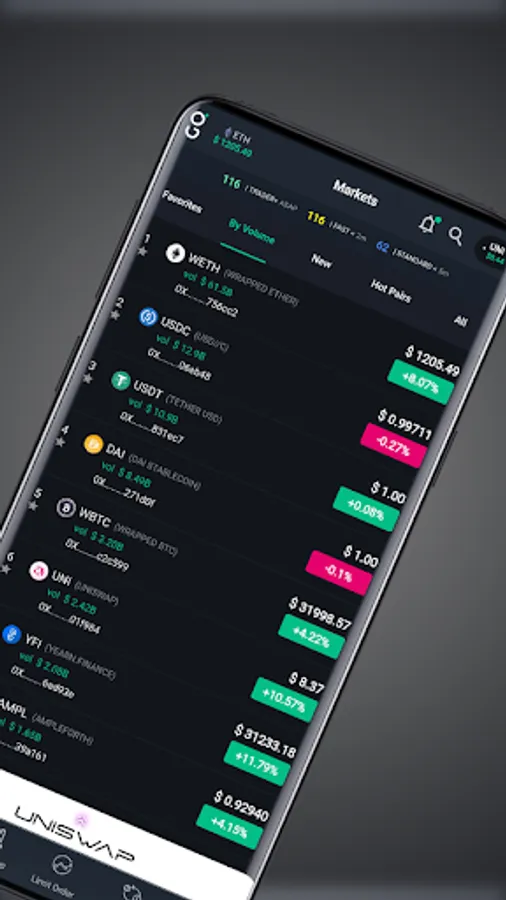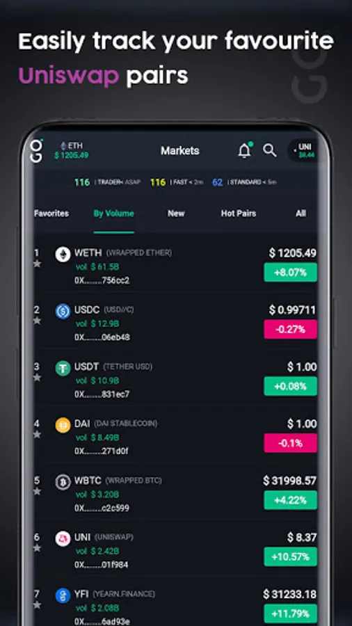 * New Tokens Alerts: Get mobile notifications as soon as a new token gets listed on Uniswap, or explore the hot pairs list to see which of the recently listed tokens have the most trading volume.