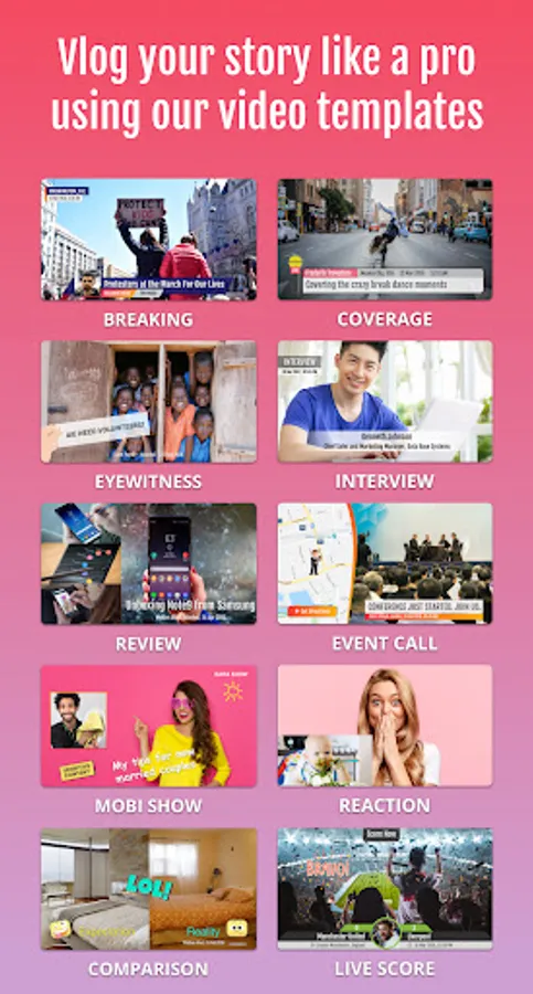 Because your story matters, myScoop made it easier for you to vlog it. Free easy-to-use “Templates” to create stunning videos like: Breaking news, Interviews, Mobi Show, Reaction & Duet Videos, Voice Over, Anonymous Recording, and more.