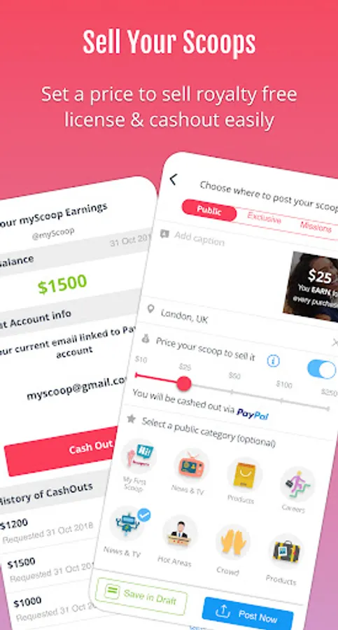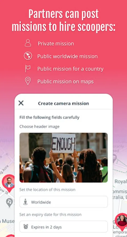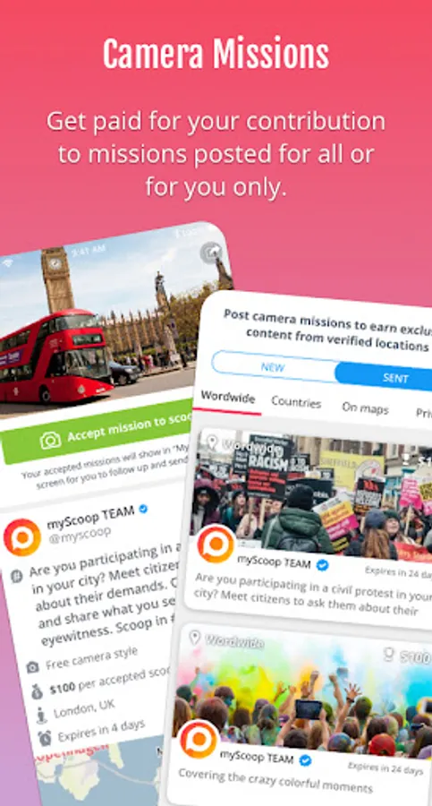 Media organisations can post camera missions on myScoop maps to all users, or hire specific scoopers based on their location or interest and grab the exact footage they need in record time.