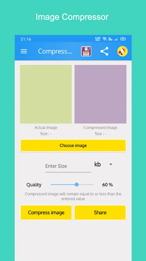 Image Compressor app main purpose is to compress images into a fixed size or below the entered size as per your requirement and also have the ability to share them to your email, social networking platform easily.