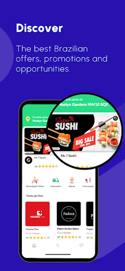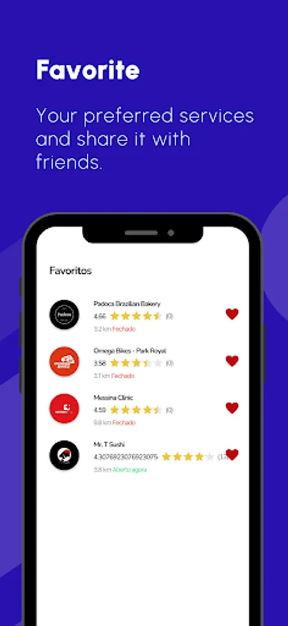Stay tuned for promotions, coupons, and recommendations of the best Brazilian services. Tap the heart button to discover and explore the best opportunities nearby.