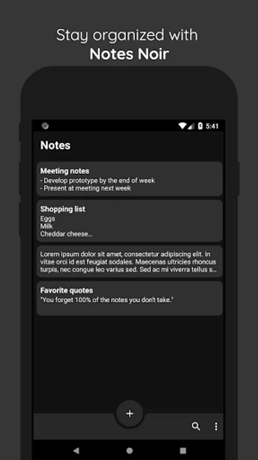 Notes Noir was designed with dark mode (or should I say "noir mode") in mind, and features a simple, intuitive interface with Material Design components. No ads, no distractions, just notes.