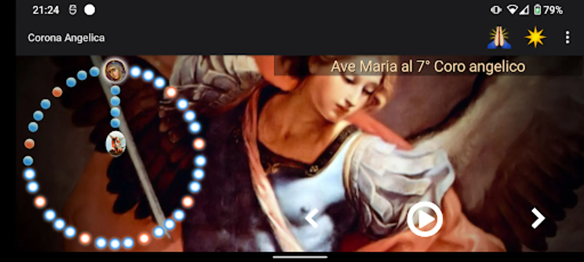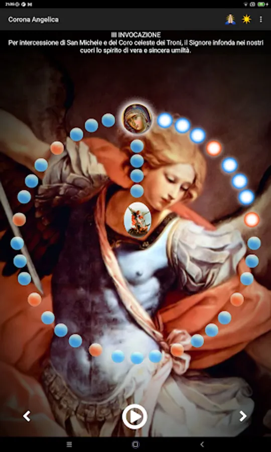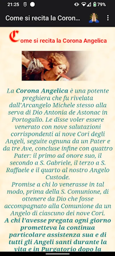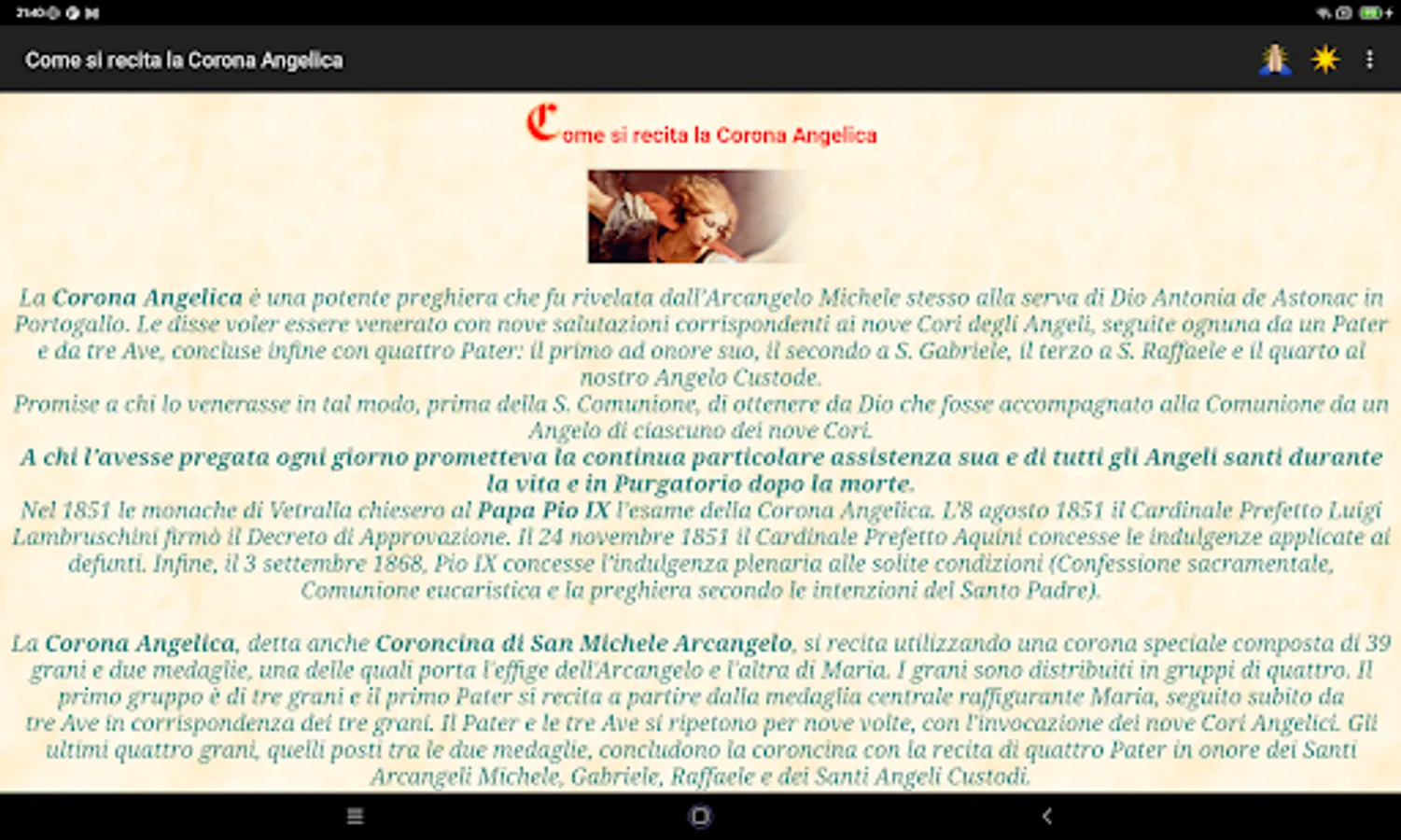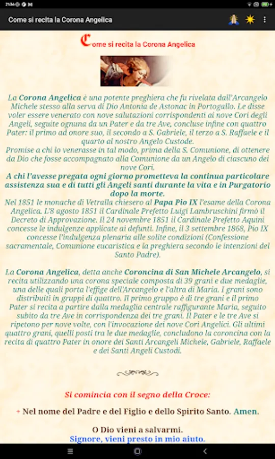This application re-proposes the classic Corona Angelica in electronic version, with the possibility to listen to it and recite it also in Audio version.