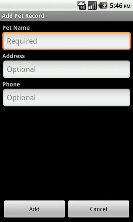 Pet section includes Name, Address (optional) and Owner Phone # (optional).