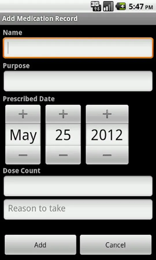 Medications section includes Name, Purpose (optional), Prescribe Date (optional), Dose Count (optional), Reason To Take (optional).
