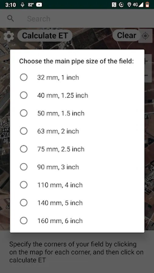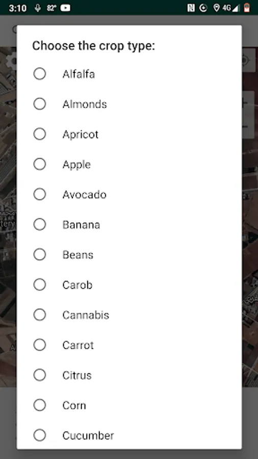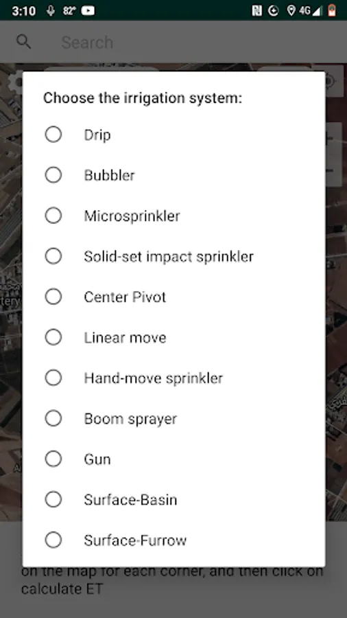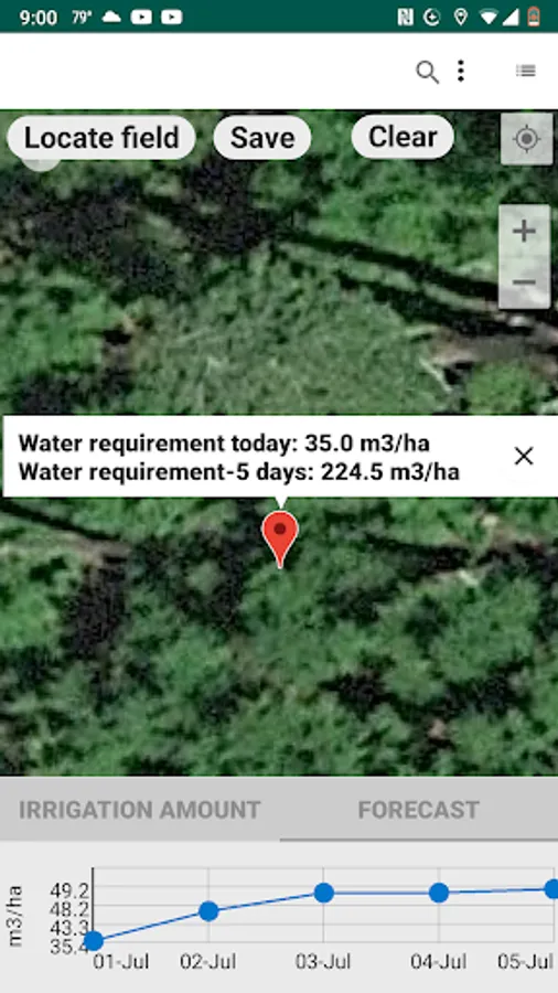 This application utilizes satellite imagery from NASA and the European Space Agency along with weather forecasts to calculate crop water requirements for irrigation management purposes. Users can delineate their fields on satellite imagery, select their crop type, irrigation system, and field pipe size, and the app will return daily water requirements and irrigation run times. Users can store their fields for later fetching of irrigation requirements in either m3/ha or m3 based on the delineated field area. Users can also opt to simply pin-point their fields, select their crop type and irrigation system, and the app will return required volume per ha. The app calculates water requirements on a daily basis and independent of water applications.